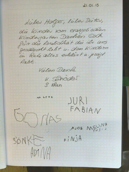 Die Kinder waren von ihren Betreuerinnen Frau Schröder und Frau Khan schön karnevalistisch geschminkt worden. Zum Abschluss bekamen alle einen Orden mit dem sie jetzt die Session begleiten können und Holger Bultmann und Dieter Gattinger bekamen von den Kindern einen schönen Eintrag ins Gästebuch (s. Bild)