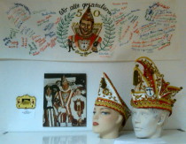 Ein Banner mit Unterschriften sämtlicher Mitglieder der Zigeunersippe Höck (heute Troisdorfer Zigeuner) zum 50. Geburtstag von Prinz Heinz I.(Eich) 1984, sowie dessen Prinzenmütze, Schiffchen und Orden. (s. Bild) von Margret Eich.